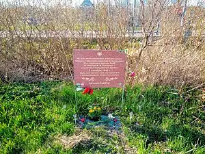 ![]() Временный памятный знак Стрельнинскому десанту на Петергофском шоссе у торгового комплекса "Лента", 9-е мая 2020 года | |||