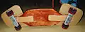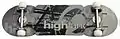 Выглядит это так: средняя, самая большая дека — бар и две поменьше по краям — плейты крепятся к бару за счёт шарнирых систем. Получается плоская конструкция — платформа. Платформа способна делать волнообразные движения в горизонтальной плоскости, относительно своей продольной оси. Далее на плейты снизу крепятся две металлические подвески с колёсами, а сверху плейтов ставятся ножные крепления.