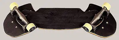 - Snakeboard — первая доска подобного рода. Бар (так называется связующее звено между платформами) доски — в отличие от современных плоских, широких, деревянных выполнен в виде фермы из пластика прямоугольного сечения и имеет изогнутую, слегка приподнятую в центре форму.