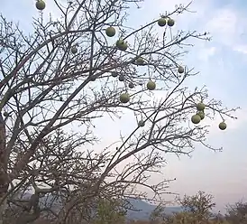 Зеленовато-белые цветки растут в плотных соцветиях на концах ветвей. Плоды появляются только после хорошего дождя. Они гладкие, твёрдые, большие, зелёные; созревая, становятся жёлтыми. Внутренняя часть плода состоит из ядра, густо наполненного семенами и окружающей его мясистой съедобной мякотью. Плодами питаются бабуины и другие обезьяны — отсюда название Обезьяний апельсин (англ. Monkey orange), — а также антилопа Канна. Листья дерева служат кормом для различных видов антилоп (например, гну, импала) и слонов. Это дерево может расти на песчаных почвах и широко распространено в Свазиленде, Мозамбике, Ботсване, Зимбабве, Намибии и Северной тропической Африке.