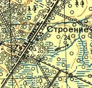 Согласно топографической карте 1939 года, деревня Строение насчитывала 24 крестьянских двора, она была центром пересечения нескольких конно-деревянных и пешеходно-деревянных дорог.
