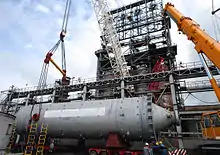 Строповка 200-тонной ёмкости с помощью четырёх стропов и металлической балки-траверса