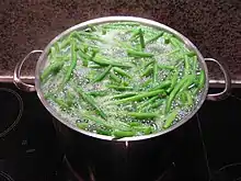 Для отваривания стручковую фасоль закладывают в кипящую подсоленную воду и держат ее на плите при активном кипении 5 минут, после чего воду сливают и помещают фасоль в холодную воду (можно добавить лед), что позволяет сохранить цвет стручков и их хрустящую структуру.