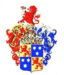 Щит разделён на четыре части. В первой и четвёртой золотых частях червлёный лев, обращенный вправо, с червлёными глазами и языком. Во второй и третьей лазуревых частях три серебряные шестиконечные звезды (две вверху, одна внизу).