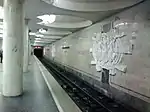 Вид на барельефы станции Студенческая. Стены станции со стороны туннеля с каждой стороны украшены четырьмя барельефами.