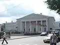 По проекту в новом здании использовались часть прочных стен и подвалы старого здания. Сравнительно не высокое квадратное в плане здание со строгими пропорциями и симметрией классических форм. Главный фасад, обращённый к Ратушной площади украшает значительно выступающий вперёд портик с шестью колоннами дорического ордера и невысоким треугольным фронтоном.