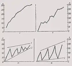 - Зубчатые кривые (рис. 1, III и IV), как сходящиеся, так и расходящиеся демонстрируют тот факт, что энерготраты на процессы дифференцировки чрезмерно велики. Как правило, такие типы кривых В. Л. Стырикович наблюдал у детей после перенесенных заболеваний, не обязательно связанных с расстройством питания. Он считал, что в этот период реконвалесценции[10] ребенок особенно чувствителен к воздействию различных неблагоприятных факторов, поскольку иммунитет его ослаблен. При этом, четвертый тип кривой Валериан Львович рассматривал как прогностически более тревожный. Статистический анализ подобных типов кривых после перенесенных конкретных заболеваний позволил позже обосновать длительность охранительного режима и медотвода от профилактических прививок.