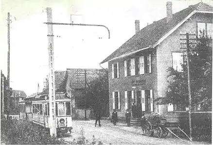 Трамвайный маршрут Страсбург—Трюштерсайм включал в себя остановки в коммуне Оффенайм (на фото, 1925 год), а также Стютзайм.