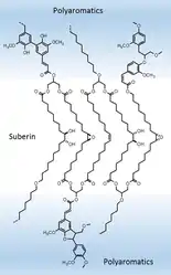 Суберин представляет собой природный полиэфир на основе глицерина, который соединяет между собой две группы компонентов: алифатические и фенольные. Алифатические включают дикарбоновые кислоты и оксикислоты (в том числе мононенасыщенные), эпоксикислоты, жирные кислоты и жирные спирты. Фенольные предшественники представлены феруловой кислотой и тирамином. В составе клеточных стенок алифатические и полифенольные остатки группируются в слои (соответственно электронно-прозрачные и электронно-плотные)[1][3].