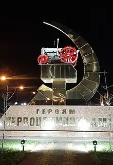 - Памятник Первоцелинникам, открыт в центре станицы в 2020 году. Внутри семиметрового серпа и молота помещен восстановленный трактор «Фордзон-Путиловец»[35].