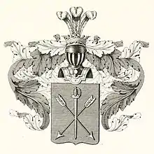 В щите, имеющем голубое поле, крестообразно изображены золотые две стрелы и шпага, остриём обращённые вниз.