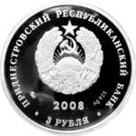 | Аверс | В центре — изображение государственного герба Приднестровской Молдавской Республики. По кругу надписи: вверху — «ПРИДНЕСТРОВСКИЙ РЕСПУБЛИКАНСКИЙ БАНК», внизу — «3 РУБЛЯ». В нижней части под гербом год выпуска монеты — «2008». | ||
