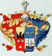 Щит разделён на четыре части. В первом золотом поле половина взлетающего чёрного одноглавого орла. Во втором лазуревом поле накрест две золотые пики остриями вверх и поперёк их серебряная изогнутая с золотой рукояткой сабля. В третьем червлёном поле три драгоценных камня (два вверху, один внизу). В четвёртом серебряном поле судно на море с двумя мачтами, поверх мачт серебряная сабля с золотой рукояткой.