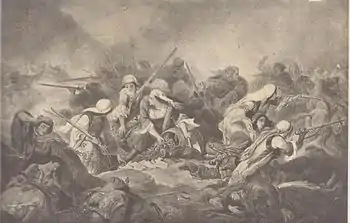Мы повесили свои ружья и сидим на высоких скалах, чьи вершины видит только солнце. Ломаем камни и выкорчёвываем коренья из бесплодной земли. Перед ужасом тиранического рабства и из уважения к Отечеству и могилам наших предков, предпочитаем смерть