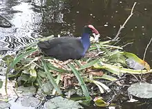 Гнездится обособленными парами или небольшими группами, состоящими из нескольких размножающихся самцов и самок, а также не принимающих участия в размножении, но помогающих в воспитании потомства молодых птиц.[2][8] Такое коммунальное гнездование более типично для восточных подвидов, тогда как на западе ареала птицы преимущественно моногамны и территориальны.[8] Период размножения сильно варьирует в разных климатических регионах. В полузасушливых его начало всегда связано с наступлением сезона дождей, на северной периферии с тёплой погодой. Гнездо несколько напоминает гнездо родственной лысухи, только немного крупнее — травянистая постройка, устраивается на воде с глубиной 30—120 см на заломе тростника или другой торчащей над поверхностью растительностью, либо в случае проточного водоёма на небольшом отдалении от неё на земляной кочке.[2][5] Расположенное на воде, оно едва поднимается над её поверхностью, и как правило, хорошо спрятано в окружающей густой растительности.
