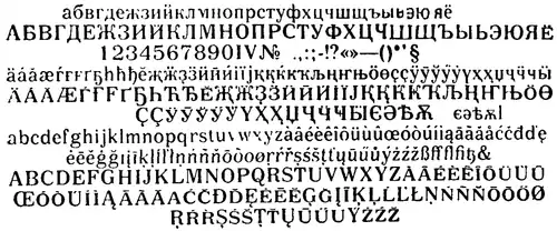 «Суммарный алфавит, принятый в СССР» — набор из 400 символов, достаточный для набора текстов на 90 языках, пользующихся кириллицей и латиницей[1]. Сходные русские и латинские буквы были совмещены (хотя на картинках русские и латинские буквы без диакритики показаны отдельно).