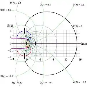 Из определения следует, что суперлогарифмическая зависимость есть обратная функция для функции поэтому, если существование и единственность аналитического расширения тетрации обеспечивается условиями асимптотических подходов к фиксированным точкам и [6] в верхней и нижней частях комплексной плоскости, то обратная функция тоже должна быть уникальной. Такая функция вещественна на реальной оси. Она имеет два экстремума в точках и Она приближается к своему предельному значению в окрестности отрицательной части реальной оси (вся полоса между разрезами показана розовыми линиями на рисунке) и медленно растёт вдоль положительного направления реальной оси. Поскольку производная на реальной оси положительна, мнимая часть остаётся положительной чуть выше реальной оси и отрицательной чуть ниже реальной оси.