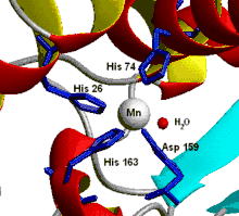 - Митохондрии эукариотических клеток и многие бактерии содержат супероксиддисмутазу с Mn (Mn-СОД). Например, митохондриальная СОД человека: PDB 1N0J (недоступная ссылка), EC 1.15.1.1, молекулярная масса 86-88 кДа. Марганец в этом ферменте координирован с белком через 3 гистидина и аспартат и с водой либо гидроксильным лигандом в зависимости от окислительного состояния Mn (Mn(II) или Mn(III)).