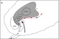 Схема суперъячейки сверху. RFD: нисходящая тяга заднего бока, FFD: нисходящий поток переднего бока, V: V-паз, U: Главный восходящий поток, I: Интерфейс восходящего потока/нисходящего потока, H: крюк эхо