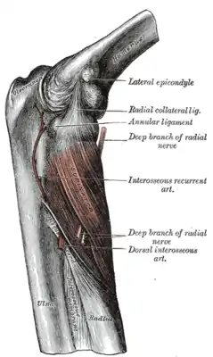 | Кровоснабжение | a. recurrens radialis, a. recurrens interossea, a. radialis |