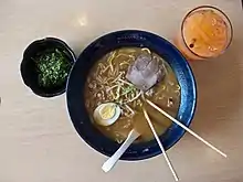 - Рамэн (яп. ラーメン) — тонкая жёлтая лапша, которую подают в наваристом говяжьем или курином бульоне, или в даси, приправленном соевым соусом или мисо, с различными топпингами: ломтиками мяса, маринованными побегами бамбука, водорослями и варёными вкрутую яйцами. Лапша для рамэна также называется «тюка-соба» (яп. 中華蕎麦 тю:ка соба).