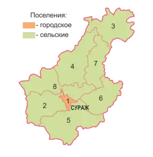 Суражский муниципальный район в рамках муниципального устройства, включает 8 муниципальных образований нижнего уровня, в том числе 1 городское поселение и 7 сельских поселений[20]: