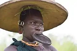 Традиционное украшение — так называемая «губная тарелка» (см. иллюстрацию).