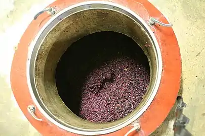 В виноделии суслом именуется отжатый из ягод сок, содержащий частицы кожицы и семян (мезга). Виноградные ягоды давят вместе с мезгой для того, чтобы насытить сусло свободными аминокислотами, также в него попадают микроорганизмы, живущие на поверхности ягод: полезные для виноделия дрожжи, а также портящие вино Acetobacter, Gluconobacter и Gluconacetobacter[10][11]. Для производства красных вин сусло ферментируют вместе с мезгой, а для белых мезгу отжимают и удаляют до ферментации[12]. При холодном отжиме в ферментируемом сусле уменьшается накопление биогенных аминов[10]. Сусло для белых и некоторых красных вин выдерживают при низкой температуре, что провоцирует рост холодоустойчивых дрожжей[13].