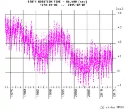 Кроме изменения скорости вращения Земли на длительном промежутке времени (и вытекающим отсюда изменением длительности суток), изо дня в день происходят незначительные изменения скорости вращения планеты, связанные с распределением масс, например, из-за уменьшения объёма мирового океана или атмосферы от колебаний их средней температуры. При охлаждении мирового океана или атмосферы Земля вращается быстрее (и наоборот), так как в результате действует закон сохранения момента импульса. Также изменение средней продолжительности суток могут вызывать геологические события, например, сильные землетрясения. Так, в результате землетрясения 2004 года в Индийском океане продолжительность суток уменьшилась примерно на 2,68 микросекунды[25]. Такие изменения отмечены и могут быть измерены современными методами.