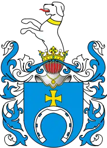 В голубом поле (первоначально в красном поле) серебряная подкова с золотым кавалерским крестом на дуге. В клейноде над шлемом в короне половина серебряной борзой вправо.
