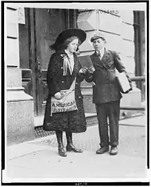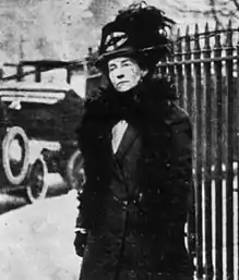 Осенью 1913 года Эммелин Панкхерст отправилась в США, чтобы предпринять тур с лекциями и предать гласности послание WSPU, а также собрать деньги на лечение своего тяжело больного сына Гарри. К этому времени тактика гражданских беспорядков суфражисток использовалась американскими активистками Элис Пол и Люси Бернс, которые обе вели кампанию с WSPU в Лондоне. Как и в Великобритании, избирательное движение в Америке было разделено на две разрозненные группы: Национальная ассоциация избирательного права женщин Америки, представляющая более воинственную кампанию, и Международный альянс избирательного права женщин, занявший более осторожный и прагматичный подход[49]. Несмотря на то, что общественное внимание, которое сопровождало визит Панкхёрст и воинственные методы, которые использовали её последовательницы, дали долгожданный импульс кампании[50], большинство женщин в США предпочли более уважаемый ярлык «суфражистка» титулу «суфражетка», которое использовали воинственно настроенные активистки[51].