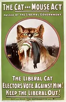 В апреле 1913 года Реджинальд Маккенна из Министерства внутренних дел принял Закон об узниках (о временном освобождении из-за ухудшающегося здоровья), который стал широко известен как «Закон кошки и мышки». Закон легализовал голодовки, освобождая суфражеток, когда их здоровье было под угрозой, чтобы снова заточить их, когда их здоровье шло на поправку[34]. Этот закон позволил правительству Великобритании избавиться от любых обвинений, которые бы вызвали смерти от голодовок, и гарантировали, что суфражетки будут слишком больными и слабыми, чтобы участвовать в демонстрациях, пока они пребывали на свободе[30]. Большинство женщин продолжали голодовку после повторного помещения в тюрьму[38]. После принятия этого закона принудительное кормление было в целом приостановлено и лишь женщины, которые были обвинены в более серьёзных преступлениях и могли повторить их после освобождения, получали принудительное кормление[39].