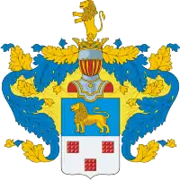 На щите дворянский коронованный шлем. Нашлемник: выходящий лев. Намёт на щите голубой, подложенный золотом.