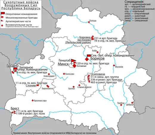 Сухопутные войска непосредственно управляются Министерством обороны и организационно подразделяются на два оперативных командования: Западное (польское направление, штаб в Гродно, создано на базе 28-й общевойсковой армии[7]) и Северо-Западное (прибалтийское направление, штаб в Борисове, создано на базе 7-й танковой армии[8]), а также отдельные воинские части.