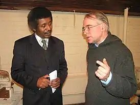 ![]() Поэт Михаил Сухотин (справа) и историк философии Ангесса Дуга Чала в Зверевском центре современного искусства, 20 апреля 2005 года. | |