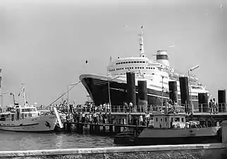 На 9-м причале, где ему предстояло пришвартоваться, собрались люди, чтобы наблюдать зрелище, от которого отвыкли за 26 послевоенных лет.