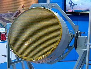 На Су-57 планируется устанавливать новую РЛС с активной фазированной антенной решёткой (АФАР), разработки НИИП[54], содержащей 1526 приёмо-передающих модулей[55], что обеспечит самолёту большую дальность обнаружения, многоканальность сопровождения целей и применения по ним управляемого ракетного оружия. Плоскость ФАР расположена под наклоном, что несколько снижает её мощность при работе по наземным целям, однако существенно снижает её вклад в ЭПР самолёта. Радар построен полностью на российской элементной базе на основе наногетероструктур арсенида галлия (GaAs) и передовых технологий антенных систем с электронным управлением лучом[52]. Новый радар был впервые представлен общественности на авиасалоне МАКС-2009, где представитель НИИП сообщил, что испытания РЛС были начаты в ноябре 2008 года, работы по совместным испытаниям с другими системами самолёта — летом 2009 года, а выпуск первой полностью готовой к боевому применению БРЛС запланирован на середину 2010 года[54].