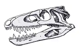 Примитивные по сравнению с более поздними крокодилами черты строения черепа выражаются в отсутствии связей между боковой стенкой мозговой коробки и квадратной костью. Последняя достигает переднеушной кости спереди от заднеушной. Верхние височные отверстия длинные. Нёбо, вероятно, открытое, как у текодонтов, хотя внутренние ноздри сдвинуты назад, а верхнечелюстные кости образуют спереди от них короткое вторичное нёбо.