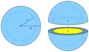 Сферическая оболочка с внутренним радиусом r и внешним радиусом R. Справа: две половины оболочки