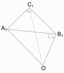 Доказательство проведём с помощью трёхгранного угла[1] OA1B1C1 со сторонами (лучами) OA1, OB1, OC1 и вершиной в точке O, плоские углы A1OC1 и C1OB1 которого равны катетам b и a данного треугольника, плоский угол A1OB1 равен его гипотенузе c, двугранный угол между гранями A1OC1 и C1OB1 равен 90 градусов, а остальные два двугранных угла равны соответствующим углам сферического прямоугольного треугольника. Этот трёхгранный угол пересечен плоскостью A1B1C1, перпендикулярной лучу OB1. Тогда углы A1C1O и A1C1B1 будут прямыми.