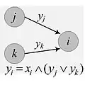 - Параллельное соединение (дизъюнктивные ребра). На рисунке 3 показан вариант представления организационных отношений между функциями и , связанных дизъюнктивной логикой обеспечения реализации выходной функции элемента системы . Дизъюнктивные организационные отношения в СФЦ являются аналогами параллельных соединений в графах связности или операторов «ИЛИ» деревьев отказов. Например, если и — события безотказной работы основного и резервного источников питания, а — событие безотказной работы питаемого ими потребителя, то уравнение определяет условия реализации выходной функции определяет безотказные условия работы данной трехэлементной схемы в целом.