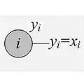 - Головная вершина. На рисунке 1 показана функциональная вершина СФЦ, в которую не заходит ни одного ребра. Такие вершины называют головными. Элементы систем, представляемые в СФЦ головными вершинами, считаются достоверно обеспеченными. Это значит, что реализация выходного функционального события головной вершины , полностью определяется свершением только собственного события , например безотказностью (собственной работоспособностью) элемента системы в течение всего заданного времени функционирования. Аналитически такое условие определяется следующим логическим уравнением . Это уравнение представляет ситуацию, когда выполнение элементом его функции в системе реализуется при одном единственном условии — безотказности этого элемента.