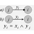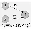 - логический оператор «И» между множеством заходящих в одну вершину конъюнктивных ребер.