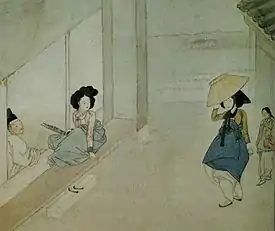Кисэн — корейские артистки развлекательного жанра, часто изображались играющими на сэнхване в традиционной корейской живописи.