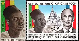 На почтовой марке, посвящённой государственному визиту в эту страну президента Франции Валери Жискар д'Эстена, позади головы президента Камеруна Ахмадю Ахиджо был изображён флаг этой страны. Жёлтая звезда на флаге ошибочно помещена не на ту сторону и не на ту полосу. Ошибка была исправлена на дополнительном выпуске этой марки в следующем 1979 году. Каталог «Скотт» об этом ничего не знает.