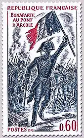 На почтовой марке, посвящённой битве за Аркольский мост, одному из известнейших эпизодов итальянского похода Наполеона, художник Альбер Декарис запечатлил момент, когда 30-летний генерал Бонапарт, командующий французской армией, под градом австрийских пуль и картечи со знаменем в руке личным примером увлекает за собой пехотинцев и занимает мост. Однако из рисунка следует, что в руке будущего императора трёхцветный флаг Франции, — между тем в действительности он нёс боевое знамя 5-го пехотного полка, не имевшее с триколором ничего общего[17].