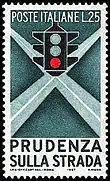 На почтовой марке Италии номиналом в 25 лир, посвящённой агитации за соблюдение правил дорожного движения, над перекрещивающимися дорогами изображён светофор. Красный свет у него внизу, что выглядит непривычно по современным меркам (правда, в те годы такие светофоры существовали в некоторых странах)[5][6][7].