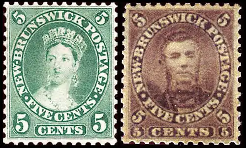 При переходе этой канадской британской колонии Нью-Брансуик с двенадцатеричной валютной системы на десятичную местному почтмейстеру Чарльзу Коннеллу по распоряжению губернатора пришлось разместить заказ на допечатку новой серии марок с изображением королевы Виктории[18] в нью-йоркской American Bank Note Company. Однако на пятицентовой почтовой марке, предназначавшейся для франкировки корреспонденции в пределах Нью-Брансуика, вместо Виктории оказался портрет самого почтмейстера. Это было сочтено оскорблением её величества и через десять дней Чарльз Коннелл подал в отставку и был принуждён возместить расходы.