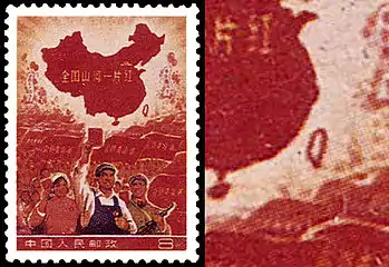 На почтовой марке номиналом в 8 фэней изображены ликующие трудящиеся с транспарантами, над ними карта Китая и лозунг «Вся страна красного цвета!» Однако вскоре после выпуска (марка печаталась в Кантоне) обнаружилось, что художнику не хватило красной краски на остров Тайвань, где, по совпадению, как раз укрылись гоминьдановцы. Марка была срочно, уже через полдня после выхода в свет, изъята из продажи с формулировкой китайских властей[15]: «В связи с отсутствием изображений архипелагов Сиша и Наньша» (Парасельские острова и часть Гуанчжоу). Тираж был уничтожен и отпечатан заново в исправленном виде. Сейчас первый выпуск оценивается каталогами в 15 000 долларов США, второй (Sc #999a) идёт по US$55. Судьба исполнителя долгое время была неизвестна.