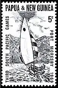 На посвящённой Третьим Южнотихоокеанским играм почтовой марке Территории Папуа — Новая Гвинея в 5 центов изображена плывущая к гористому острову спортивная парусная яхта — без руля и штурвала.